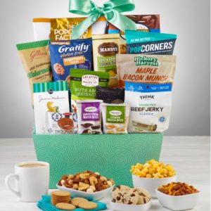 This impressive gift basket has a wide selection of fruits & sweets that is sure to make their day! This handsome walnut stained wicker & rope basket is fabric lined and filled with six types of fresh fruit, nuts, snacks, chocolate and other candies. They’ll love you for sending this gift!